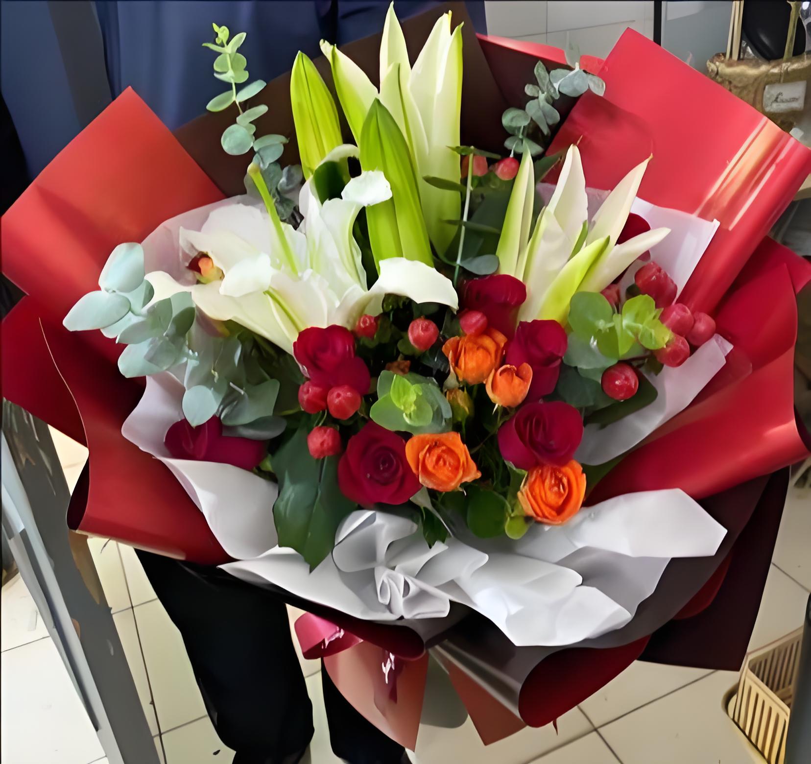 金塔县花店包11枝红玫瑰、2枝多头白百合、6枝橙色多头玫瑰、红豆、尤加利叶